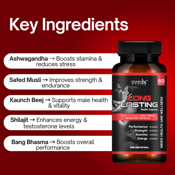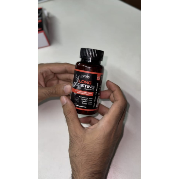 Long Lasting Capsule is a premium Ayurvedic formula designed to enhance stamina, endurance, and timing Made with 12+ powerful herbs like Ashwagandha, Safed Musli, Shilajit, and Kaunch Beej, it naturally supports performance, blood circulation, and confidence—without any synthetic chemicals or side effects.